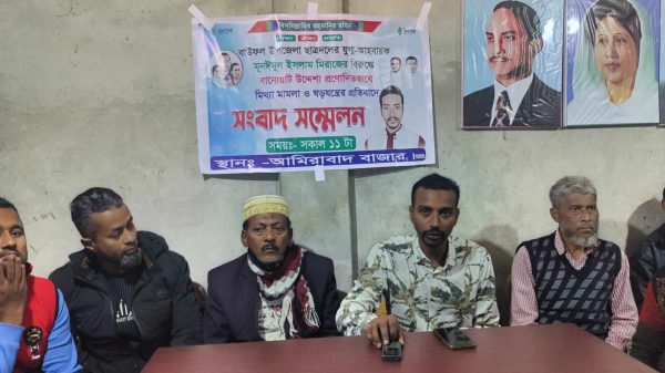 পটুয়াখালী বাউফল উপজেলা ছাত্রদলের এক নেতার বিরুদ্ধে বানোয়াট ভিত্তিহীন উদ্দেশ্য প্রণোদিতভাবে মিথ্যা মামলা দেওয়ায় সংবাদ সম্মেলন অনুষ্ঠিত হয়েছে। বুধবার সকালে উপজেলার কনকদিয়া ইউপির বিএনপি ও সহযোগী সংগঠনের কার্যালয়ে এই সংবাদ সম্মেলন অুনষ্ঠিত হয়। সংবাদ সম্মেলনে লিখিত বক্তব্য পাঠ করেন উপজেলা ছাত্রদলের যুগ্ম আহবায়ক মূনঈমুল ইসলাম মিরাজ। ওই সময় তিনি বলেন ১৩ জানুয়ারী সকালে কনকদিয়া ইউপির ৭নং ওয়ার্ডের হাওলাদার বাড়ীতে থুথু ফালানোকে কেন্দ্র করে একই বাড়ীর রুনু বেগম ও মাসুদ হাওলাদারের সাথে সাথে ঝগড়ার সুত্রপাত ঘটে। বিকালে ওই ঘটনার বিষয় নিয়ে দু পক্ষের সাথে আলোচনা চলছে। এমন সময় কিছু অজ্ঞত পরিচয়ের লোকজন এসে মাসুদ হাওলাদারকে দেশীয় অস্ত্র দিয়ে বেদরক মারপিঠ করে। তার স্ত্রী রতœা বেগম তাকে বাচাতে গেলে তাকেও মারধর করা হয়। ঘটনার সময় আমি উপস্থিত ছিলাম না। কতিপয় স্বার্থন্বেষী লোকজন সামাজিক ভাবে হেও করার জন্য উক্ত ঘটনার সাথে জড়িতদের সাথে আমাকেও আসামী করা হয়। বাশের কেল্লা নামক একটি ভেরিফাইট ফেইসবুক পেইজ থেকেও আমার নামে অপপ্রচার চালানো হয়েছে। আমি এর তিব্র নিন্দা জানাই। উপজেলা যুবদল সদস্য তোফাজ্জেল হোসেন তপুর সভাপতিত্বে আয়োজিত সংবাদ সম্মেলনে অন্যান্যদের মধ্যে উপস্থিত ছিলেন, বাউফল সরকারি বিশ্ব বিদ্যালয় কলেজ শাখা ছাত্রদল আহবায়ক আপেল মাহমুদ মুন্না, কনকদিয়া ইউনিয়ন ছাত্রদল সহ সভাপতি কাজী মাসুদ, সমাজ সেবক মঞ্জু সরোয়ার সহ ইউনিয়ন বিএনপি ও সহযোগী সংগঠনের নেতাকর্মীরা।