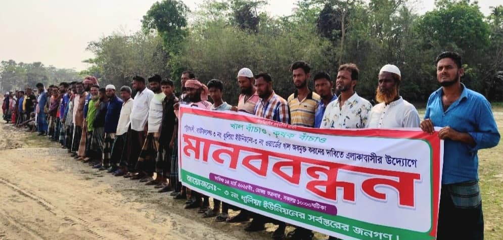খাল অবমুক্ত করার দাবিতে কৃষক ও এলাকাবাসীর মানববন্ধন।